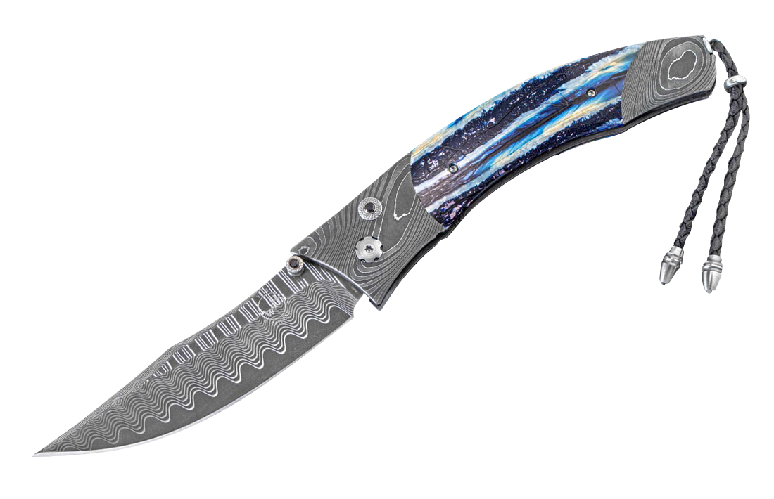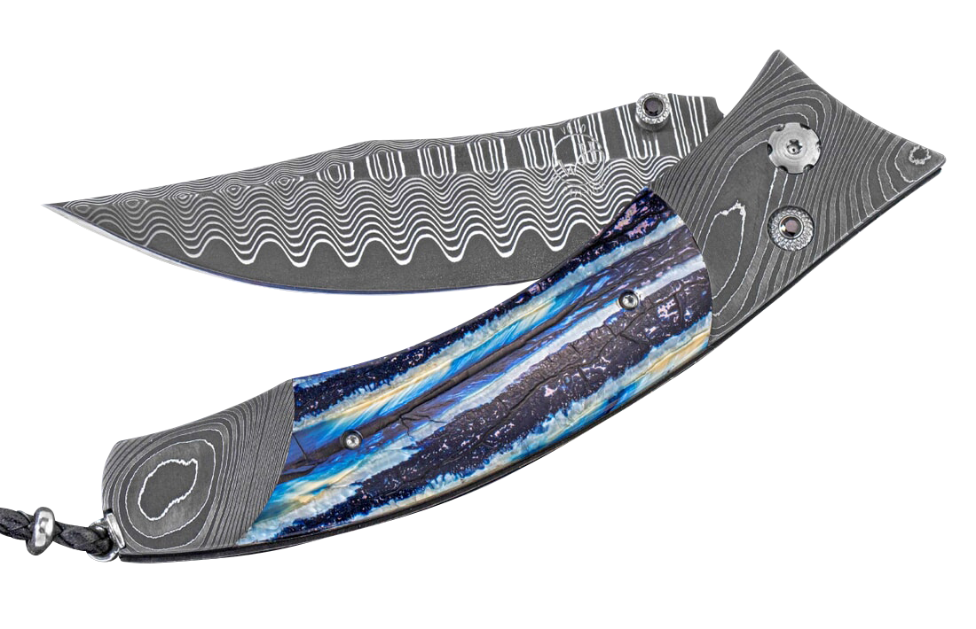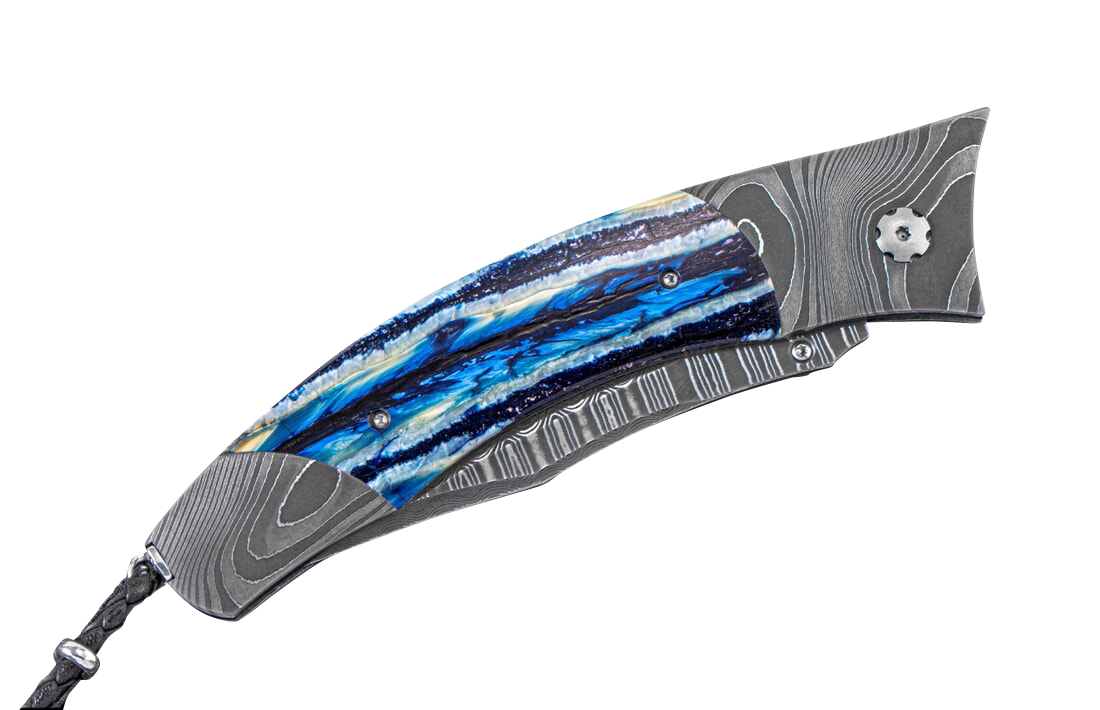 - Material: Etched damascus, fossil mammoth tooth, spinel, wave damascus